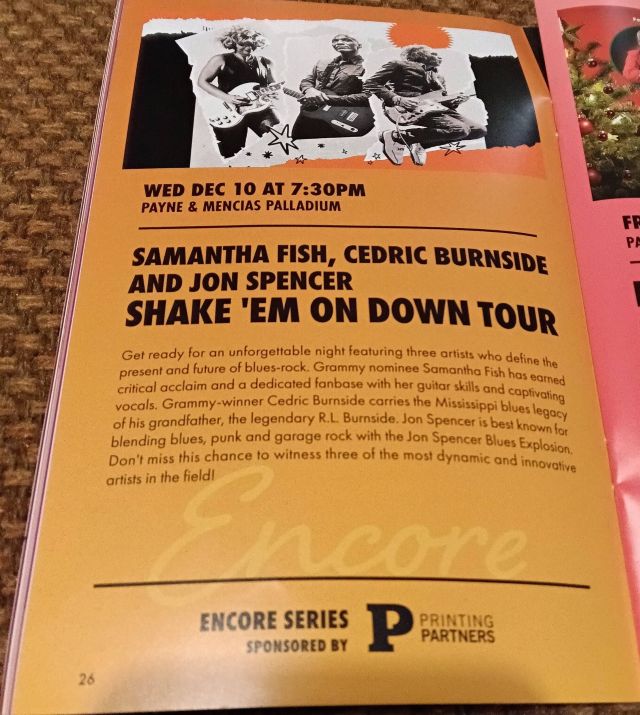 “The acoustically refined Payne & Mencias Palladium at Allied Solutions Center for the Performing Arts provided an ideal setting on December 10, 2025 for the kickoff of the Shake ’Em On Down Tour, a powerhouse assembly of contemporary blues, rock, and roots music featuring Samantha Fish, Cedric Burnside & Jon Spencer. From the moment the lights dimmed to the final encore, the evening delivered a compelling arc of musical styles and generational energy that underscored why this trio of artists has become one of the most talked-about bills in today’s blues-rock circuit. The concert is part of the 2025-2026 Center Presents Season sponsored by Allied Solutions, drawing both seasoned blues aficionados and newer fans eager to witness a dynamic live set. ”