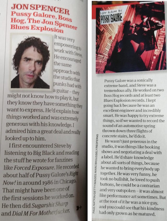 I first encountered Steve by listening to Big Black and reading the stuff he wrote for fanzines like Forced Exposure. He recorded about half of Pussy Galore’s Right Now! in around 1986 in Chicago. That might have been one of the first sessions he worked on. He then did Sugarshit Sharp and Dial M For Motherfucker.