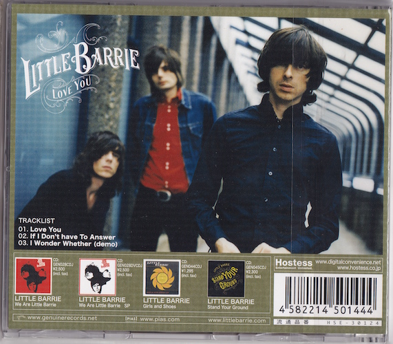 INSIDE SLEEVE: Details as above, website addresses and the following text; “(p) and © PIAS/Wall Of Sound Limited 2006. 508.0048.122 LC07800. GEN 048CD.” DISC: “Little Barrie Love You (p) and © PIAS/Wall Of Sound Ltd 2006. All rights reserved. Unauthorised copying, reproduction, hiring, public performance and broadcasting prohibited. 508.0048.122. LC07800. SABAM/BIEM. GEN048CD. [Genuine/[PIAS]/Wall of Sound logos].” TEXT FROM PRESS RELEASE: “Love You is the first single from Little Barrie’s second album Stand Your Ground and comes out on January 15 2007 through Genuine Recordings. A restless confession of desire, Love You digs in its elbows and pushes its way to the front. With skiffling drums, a popping bass line and a crackling lead guitar, it’s indicative of the more urgent rockabilly blues featured on the band’s new album. It is a sound made all the more vital for the renewed strength of Barrie’s song writing. CD b-side If I Don’t Have To Answer encapsulates a theme of defiance and resistance running through their new material. The demo version for I Wonder Whether – unavailable elsewhere – is also included on the CD single whilst the download format includes the DJ Nu Mark remix of Burned Out previously only available on the Greener Pastures 7”. There is a toughness to Little Barrie these days; new drummer Billy Skinner has joined forces with frontman Barrie Codogan and bassist Lewis Wharton, to produce a newly energised rattling rhythm ‘n’ blues. And Little Barrie have every reason to be energised… a year of drummer changes and producer switches has been emphatically overcome with a collection of “tough yet tender” songs that make up the new LP. They’ve backed this up with a clutch of headlining dates, a tour with Primal Scream and by beating Lily Alien into the Japanese album charts. They mark the release of their second album with a headline show at London’s Scala on February 22nd. The album Stand Your Ground is released on Jan 29th.” |