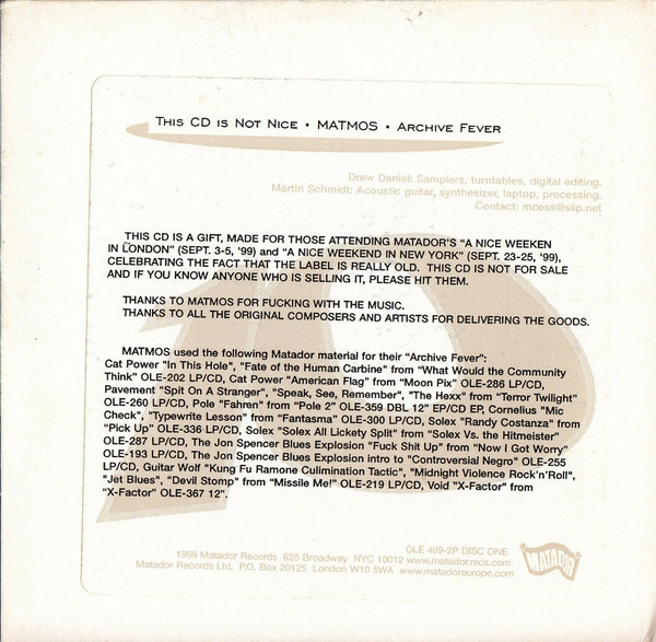 | “This CD is a gift, made for this attending Matador’s “A Nice Weekend in London” (Sept, 3-5, ’99) and “A Nice Weekend in New York” (Sept, 23-25, ’99), celebrating the fact that the label is really old. This CD is not for sale and if you know anyone who is selling it, please hit them