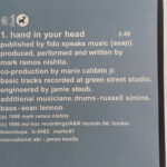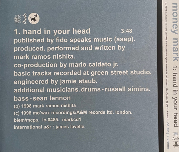 | 01. Hand In Your Head Writer: Mark Ramos-Nishita Produced: Mark Ramos-Nishita & Mario Caldato Jnr Published by Fido Speaks Music (ASCAP) Engineered: Jamey Staub Basic tracks recorded at Greene Street Studio Drums: Russell Simins Bass: Sean Lennon Run Time: 3:43 |