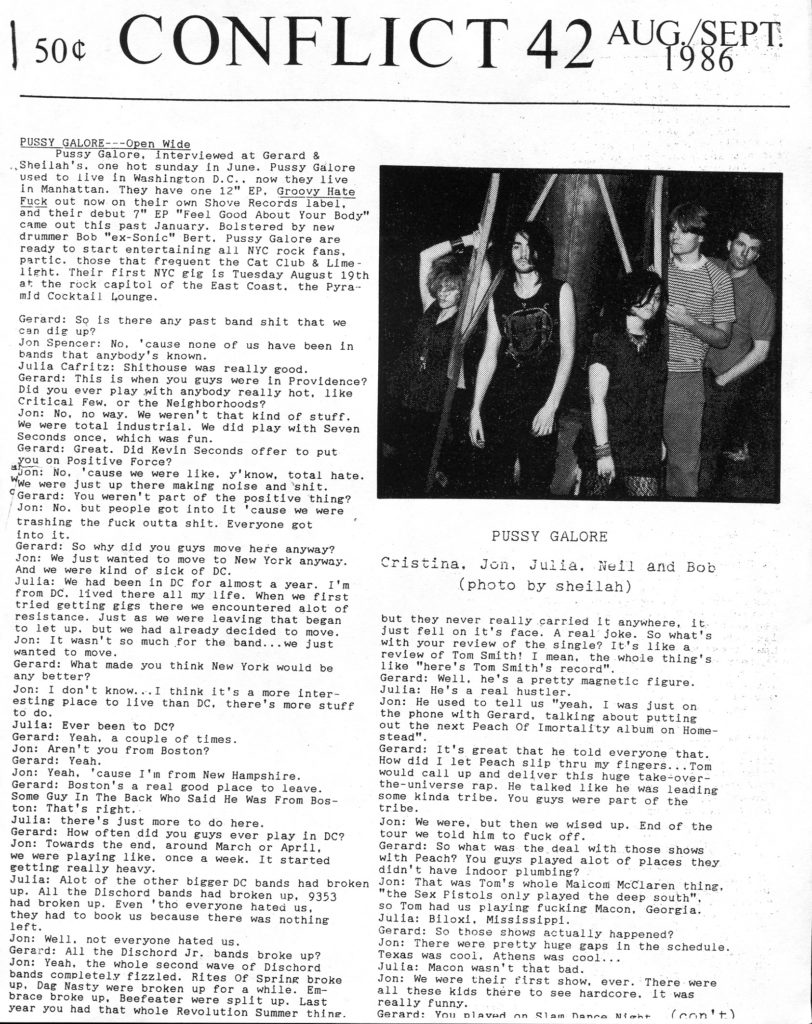 | Article on Pussy Galore from Conflict #42.Conflict is a fanzine run by Gerard Cosloy of Matador Records, issue #46 included a review of Right Now!.