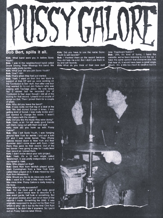 Bob: After I left Sonic Youth, I was hanging around New York for awhile. I put out a solo EP and I was kinda bored. They (Pussy Galore) moved down to New York and their drummer didn’t come down with them. I met them, they gave me their record. Out of the two bands I was going to play for I really liked their record so I joined them.