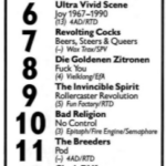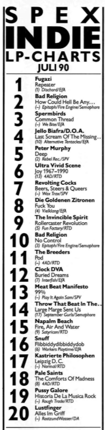 The artwork is made to look like it’s part of a series but the vinyl releases does not include all the Spanish sleeve notes featured on the CD issue. The run-out groove engraving includes all the details from the US pressing along with UK catalogue number. nb. images also show a chart from Spex magazine (July 1990) listing the album at number 19 on the ‘indie album chart’. The Pussy Galore recording of Little Red Rooster leaves out one verse in comparison to the Willie Dixon recording and is listed as Eric Clapton Must Die on the Rough Trade and Danceteria vinyl editions (but not the Caroline version). Released by Caroline in the US, Rough Trade in UK and Danceteria in France. Crawfish was included on a promotional compilation issued by Caroline and titled On A Nineties Tip Hear and Now. This album features two cover versions; Little Red Rooster (Willie Dixon) and Crawfish (Elvis Presley). Pussy Galore – Historia De La Musica Rock (LP, US) |