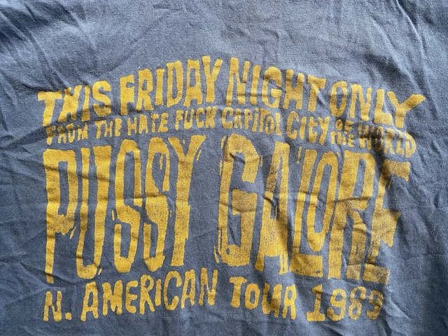 | Pussy Galore shirt sold via Kung-Fu Nation featuring the classic “This Friday Night Only, from the hate fuck capitol city of the world, Pussy Galore” lettering which was also used on the This Friday Night Only LP.