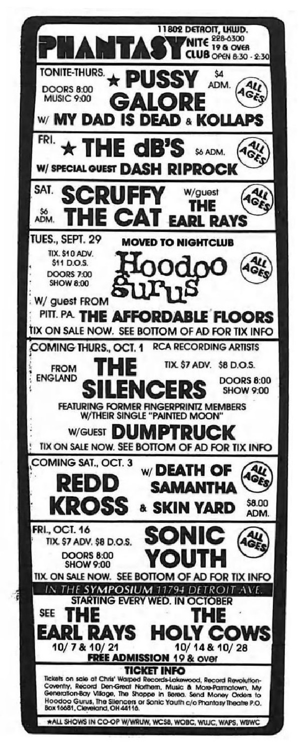 Pussy Galore show at Phantasy Niteclub, 11802 Detroit Avenue, Lakewood, OH, US with My Dad Is Dead and Kollaps on 24 September 1987.