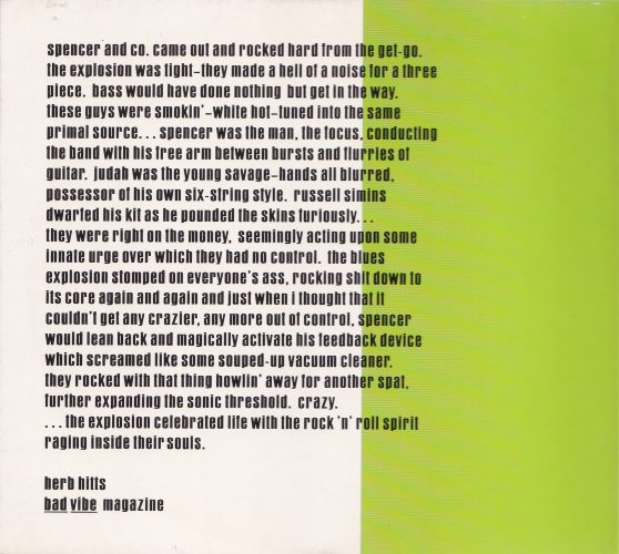 they were right on the money, seemingly acting upon some innate urge over which they had no control. the blues explosion stomped on everyone’s ass, rocking shit down to its core again and agian and just when i thought that it couldn’t get any crazier, any more out of control, spencer would lean back and magically activate his feedback device which screamed like some souped-up vacuum cleaner. they rocked with that thing howlin’ away for another spat, further expanding the sonic threshold. crazy. …the explosion celebrated life with rock ‘n’ roll spirit raging inside their souls.herb hitts “thanks to peter arsenault, boche billions, cristina, jeff evans larry hardy, robert gordon, jenna, the jesus lizard, cheryl payne, ken pope and tim warren.” |