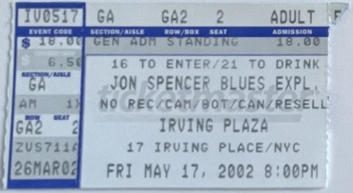 The Jon Spencer Blues Explosion shows at Irving Plaza, 17 Irving Place, New York City, NY, US on 17 and 18 May 2002.