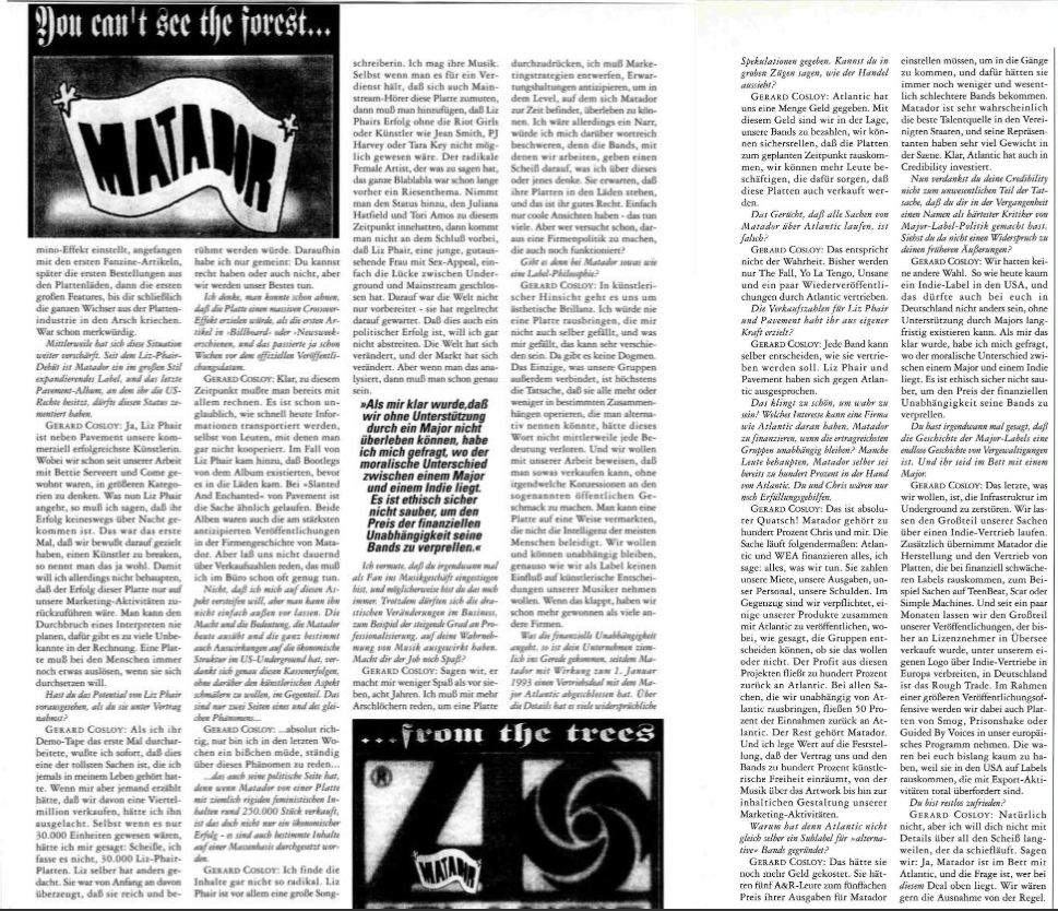 >>When I realized that we couldn’t survive without support from a major label, I wondered where the moral difference lies between a major and an indie label. It’s certainly not ethically sound to alienate your bands for the sake of financial independence.< I suspect you got into the music business as a fan at some point, and probably you always have. Nevertheless, the drastic changes in the business, for example, the increasing degree of professionalization, must have affected your perception of music. Do you still enjoy the job? GERARD COSLOY: Let's say I enjoy it less than I did eight years ago. I have to talk to more assholes to make a record To push it through, I have to devise marketing strategies, anticipate expectations, in order to survive at the level where Matador currently is. However, I'd be a fool to complain about it at length, because the bands we work with don't give a damn what I think about this or that. They expect their records to be in the shops, and that's their right. Just having cool views—lots of people do that. But who tries to turn that into a company policy that actually works? Does Matador have something like a label philosophy? GERARD COSLOY: From an artistic point of view, we're all about aesthetic brilliance. I would never release an album that I didn't personally like, and what I like can vary greatly. There are no dogmas. The only other thing that connects our groups is perhaps the fact that they all operate more or less within certain contexts that one could call alternative, if that word hadn't lost all meaning by now. And we want to prove with our work that you can sell something like that without making any concessions to so-called public taste. You can market an album in a way that doesn't insult the intelligence of most people. We want to and can remain independent, just as we, as a label, don't want to influence the artistic decisions of our musicians. If that works, we've already gained more than many other companies Regarding financial independence, your company has been the subject of quite a bit of talk since Matador signed a distribution deal with the major label Atlantic, effective January 1, 1993. There has been a lot of conflicting from the trees speculation about the details. Can you give us a rough outline of what the deal entails? GERARD COSLOY: Atlantic gave us a lot of money. With this money, we are able to pay our bands, we can ensure that the records are released on time, we can employ more people to make sure that these records are sold. The rumor that all Matador stuff is handled by Atlantic is false? GERARD COSLOY: That's not true. So far, only The Fall, Yo La Tengo, Unsane, and a few reissues are distributed by Atlantic. Did you achieve the sales figures for Liz Phair and Pavement on your own? GERARD COSLOY: Every band can decide for themselves how they want to be distributed. Liz Phair and Pavement have spoken out against Atlantic. That sounds too good to be true! What interest could a company like Atlantic have in financing Matador if the most profitable groups remain independent? Some claim that Matador itself is already 10 percent owned by Atlantic. You and Chris would just be pawns GERARD COSLOY: That's absolute nonsense! Matador belongs 100% to Chris and me. Here's how it works: Atlantic and WEA finance everything, I mean everything, we do. They pay our rent, our expenses, our staff, our debts. In return, we're obligated to release some of our products together with Atlantic, although, as I said, the bands can decide whether they want to or not. The profit from these projects goes 100% back to Atlantic. For everything we release independently of Atlantic, 50% of the revenue goes back to Atlantic. The rest belongs to Matador. And I want to emphasize that the contract grants us and the bands 100% artistic freedom, from the music to the artwork to the content of our marketing activities. Why didn't Atlantic just create their own sublabel for alternative bands? GERARD COSLOY: That would have cost them even more money. They would have had to hire five A&R people at five times the price of their expenditure on Matador to get things going, and they still would have gotten fewer and significantly worse bands. Matador is very likely the best source of talent in the United States, and its representatives carry a lot of weight in the scene. Sure, Atlantic also invested in credibility. Now, you owe a not insignificant part of your credibility to the fact that you have made a name for yourself in the past as the toughest critic of major-label politics. Don't you see a contradiction with your earlier statements? GERARD COSLOY: We had no other choice. Just like today, hardly any indie label in the US, and it's probably no different for you in Germany, can exist long-term without support from majors. When that dawned on me, I asked myself where the moral difference lies between a major and an indie label. It's certainly not ethically sound to alienate your bands for the sake of financial independence. You once said that the history of major labels is an endless history of rape. And you're in bed with a major GERARD COSLOY: The last thing we want is to destroy the underground infrastructure. We release the majority of our material through an indie distributor. Additionally, Matador handles the production and distribution of records released by financially weaker labels, for example, releases on TeenBear, Scar, or Simple Machines. And for the past few months, we've been distributing the majority of our releases, which were previously sold to licensees overseas, under our own logo through indie distributors in Europe; in Germany, that's Rough Trade. As part of a larger release offensive, we'll also be adding records by Smog, Prisonshake, and Guided By Voices to our European lineup. These were previously hard to find in your area because they're released in the US on labels that are completely overwhelmed by export activities. Are you c