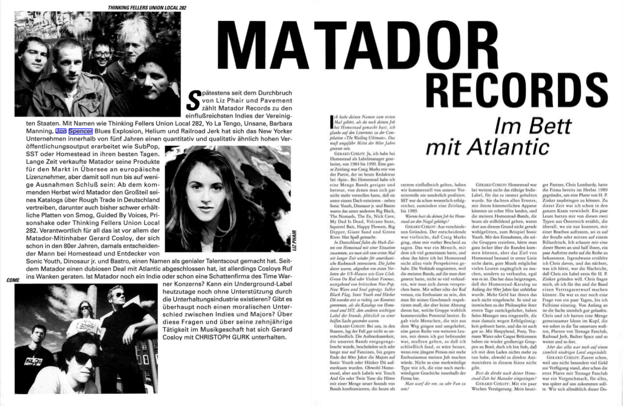 COME S considers Matador Records one of the most influential independent labels in the United States. With names like Thinking Fellers Union Local 282, Yo La Tengo, Unsane, Barbara Manning, Jon Spencer Blues Explosion, Helium, and Railroad Jerk, the New York-based company has, within five years, achieved a release output that is both quantitatively and qualitatively comparable to that of SubPop, SST, or Homestead in their heyday. For a long time, Matador sold its products for the overseas market to European licensees, but this is now set to end, with only a few exceptions: Starting this fall, Matador will distribute the majority of its catalog in Germany through Rough Trade, including previously hard-to-find records by Smog, Guided By Voices, Prisonshake, and Thinking Fellers Union Local 282. The driving force behind all this is primarily Matador co-owner Gerard Cosloy, who made a name for himself as a brilliant talent scout back in the 80s, when he was a key figure at Homestead and discovered Sonic Youth, Dinosaur Jr., and Bastro. However, since Matador entered into a dubious deal with Atlantic, Cosloy’s reputation has been tarnished. Is Matador still an indie label or already a front company for the Time Warner corporation? Can an underground label still exist today without support from the entertainment industry? Is there even a moral difference left between indies and major labels? Gerard Cosloy spoke with Christoph Gurk about these questions and about his ten years in the music business. LIZ PHAIR