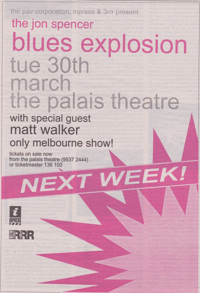The Jon Spencer Blues Explosion show at The Palais, Melbourne, Australia with Matt Walker on 30 March 1999.