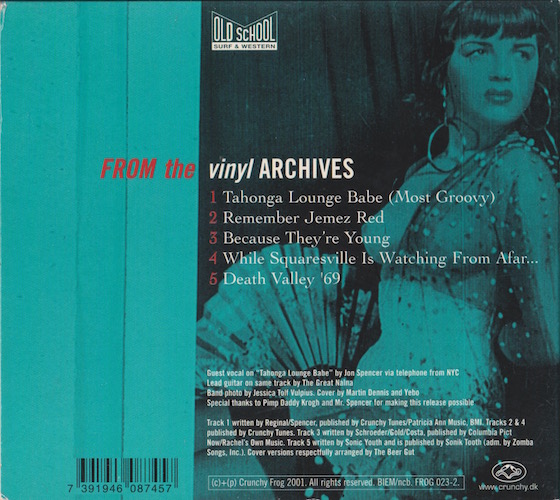 | Produced by The Great Nalna & The Tremolo Beer Gut Recorded through Shure 57’s and Sennheiser 421’s at Gula and Tambourine Studios, Malmö01. Tahonga Lounge Babe (Most Groovy) Writers: Reginal/Spencer Guest Vocal: Jon Spencer (via telephone from NYC) Lead Guitar: The Great Nalna. Taken from the vinyl album “Under the Influence of…” (FROG 019-1) Run Time: 3:37 02. Remember Jemez Red 03. Because They’re Young 04. While Squaresville Is Watching from Afar… 05. Death Valley ’69 |