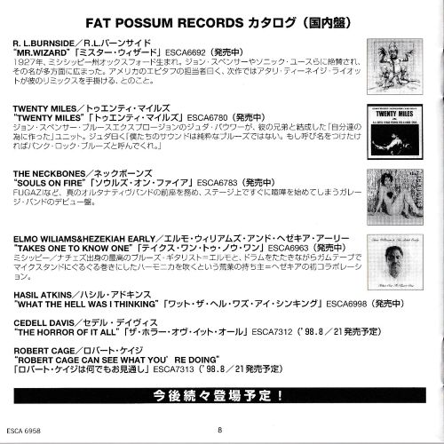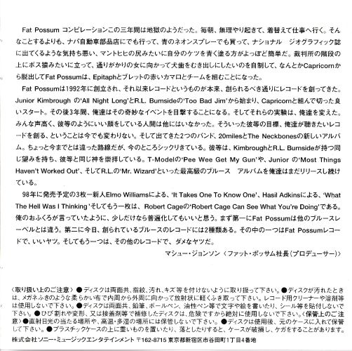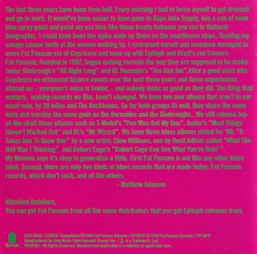 | “The last three years have been from hell. Every morning I had to force myself to get dressed and go to work. It would’ve been easier to have gone to Napa Auto Supply, buy a can of neon blue spray paint and paint my ass blue like those freaky baboons you see in National Geographic. I could have been alpha male up there on the courthouse steps, flashing my savage canine teeth at the women walking by. I restrained myself and somehow managed to move Fat Possum out of Capricorn and team up with Epitaph and Brett’s red Camaro.Fat Possum, founded in 1992, began making records the way they are supposed to be made: Junior Kimbrough’s ‘All Night Long’ and RL Burnside’s ‘Too Bad Jim’. After a good start with Capricorn we witnessed bizarre events over the new three years and these experiences altered us: – everyone’s voice is louder, – and nobody looks as good as they did. The thing that matters, making records we like, hasn’t changed. We have two new albums that aren’t in our usual vein, by 20 miles and The Neckbones. So far both groups fit well; they share the same lusts and worship the same gods as the Burnsides and the Kimbroughs.. We still release top-of-the-shelf blues albums such as T-Model’s ‘Pee Wee get My Gun’, Junior’s ‘Most Things Haven’t Worked Out’ and RL’s Mr Wizard. We have three blues albums slated for ’98; ‘It Takes One To Know One’ by a new artist: Elmo Williams, one by Hasil Adkins called ‘What The Hell Was I Thinking’ and Robert Cage’s ‘Robert Cage Can See What You’re Doing’.My Momma says it’s okay to generalize a little. First Fat Possum is not like any other blues label. Second, there are only two kinds of blues records that are made today: Fat Possum records, which don’t suck, and all the others.- Matthew Johnson.”