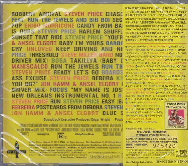 | 01. Steven Price – Robbery Arrival 02. Danger Mouse Feat. Run the Jewels and Big Boi – Chase Me 03. Ennio Morricone – Secondo Intermezzo Pop 04. Steven Price – Candy From Baby / What’s In There Is Ours 05. The Foundations – Harlem Shuffle 06. Steven Price – Sunset That Ride 07. Lily James & Ansel Elgort – You’re Back! 08. Barbara Lewis – Baby I’m Yours 09. Unloved – Cry Baby Cry 10. Steven Price – Keep Driving and Never Stop 11. The Steve Miller Band – Threshold 12. Boga – Nowhere to Run (Baby Driver Mix) 13. Vinnie Maniscalco – TaKillYa (Baby Driver Mix) 14. Run the Jewels – Run the Jewels 15. Steven Price – Bananas 16. Boards of Canada – Ready Let’s Go 17. Steven Price – Dumb-Ass Excuse 18. Kid Koala – Debora 19. Jon Hamm – What Did You Do? 20. Focus – Hocus Pocus (Baby Driver Mix) 21. Ansel Elgort – My Name Is Joseph 22. R.E.M – New Orleans Instrumental No 1 23. Steven Price – Lucky Charm 24. Steven Price – Run 25. Sky Ferreira – Easy (Baby Driver Mix) 26. Steven Price – Postcards from Debora 27. Jon Hamm & Ansel Elgort – Killer Track 28. Mint Royale – Blue Song |