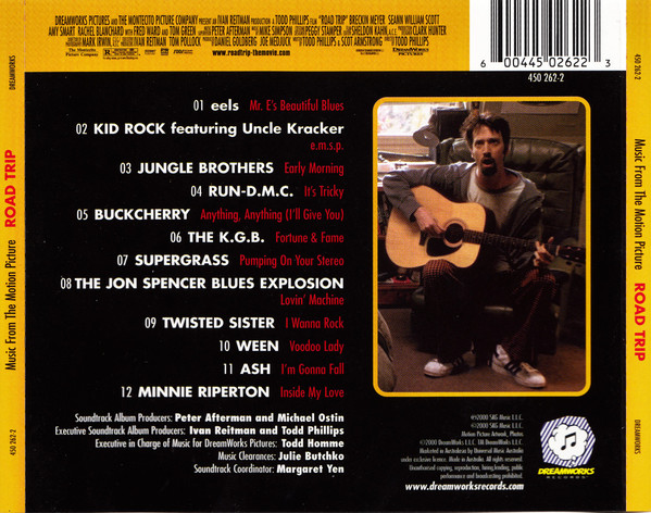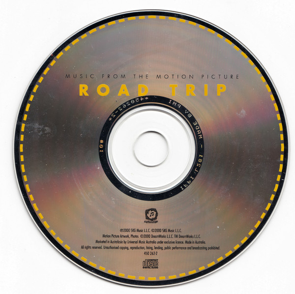DISC: “Music From The Motion Picture Road Trip. © 2000 SKG Music L.L.C. Motion Picture Artwork, Photos © 2000 DreamWorks L.L.C., TM DreamWorks L.L.C. DreamWorks Records. All Rights Reserved. Manufactured and distributed in Canada by Universal Music. Unauthorized reproduction, copying and rental of this recording is prohibited by law. 0044-50262-2.” REAR: “www.universalcanada.com |