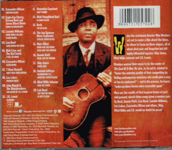| Produced: Wim Wenders/Alex Gibney A&R Direction: Steve Berkowitz/Jerry Rappaport Mastered: Joseph M. Palmaccio at Sony Music Studios, New York City 01. Cassandra Wilson – Vietnam Blues 02. Eagle-Eye Cherry, Vernon Reid and James Blood Ulmer – Down In Mississippi 03. Lucinda Williams – Hard Times Killing Floor Blues 04. Lou Reed – Look Down The Road 05. Nick Cave and The Bad Seeds – I Feel So Good 06. Cassandra Wilson – Vietnam Blues 07. T Bone Burnett – Don’t Dog Your Woman 08. Los Lobos – Voodoo Music 09. John Mayall & The Bluesbreakers – The Death Of J.B. Lenoir 10. J. B. Lenoir – Alabama 11. Shemekia Copeland – God’s Word 12. Alvin Youngblood Hart – Illinois Blues 13. Beck – I’m So Glad 14. The Jon Spencer Blues Explosion – Special Rider Blues 15. Marc Ribot – Dark Was The Night, Cold Was The Ground 16. Bonnie Raitt – Devil Got My Woman 17. Skip James – Crow Jane 18. Garland Jefferys – Washington D.C. Hospital Center Blues 19. Blind Willie – Johnson – Soul Of A Man 20. Lou Reed – See That My Grave Is Kept Clean |