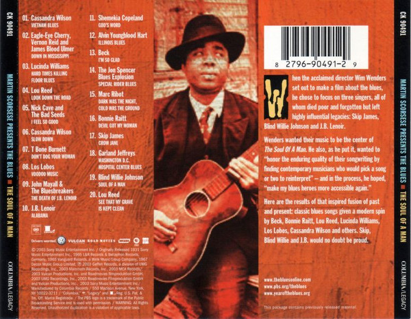 | Produced: Wim Wenders/Alex Gibney A&R Direction: Steve Berkowitz/Jerry Rappaport Mastered: Joseph M. Palmaccio at Sony Music Studios, New York City 01. Cassandra Wilson – Vietnam Blues 02. Eagle-Eye Cherry, Vernon Reid and James Blood Ulmer – Down In Mississippi 03. Lucinda Williams – Hard Times Killing Floor Blues 04. Lou Reed – Look Down The Road 05. Nick Cave and The Bad Seeds – I Feel So Good 06. Cassandra Wilson – Vietnam Blues 07. T Bone Burnett – Don’t Dog Your Woman 08. Los Lobos – Voodoo Music 09. John Mayall & The Bluesbreakers – The Death Of J.B. Lenoir 10. J. B. Lenoir – Alabama 11. Shemekia Copeland – God’s Word 12. Alvin Youngblood Hart – Illinois Blues 13. Beck – I’m So Glad 14. The Jon Spencer Blues Explosion – Special Rider Blues 15. Marc Ribot – Dark Was The Night, Cold Was The Ground 16. Bonnie Raitt – Devil Got My Woman 17. Skip James – Crow Jane 18. Garland Jefferys – Washington D.C. Hospital Center Blues 19. Blind Willie – Johnson – Soul Of A Man 20. Lou Reed – See That My Grave Is Kept Clean |