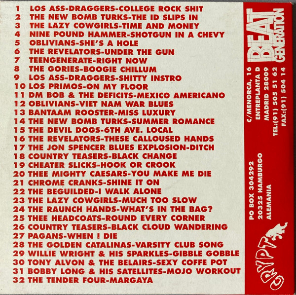 | 01. Los Ass-Draggers – College Rock Shit 02. New Bomb Turks – The Id Slips In 03. Lazy Cowgirls – Time And Money 04. Nine Pound Hammer – Shotgun In A Chevy 05. Oblivians – She’s A Hole 06. The Revelators – Under The Gun 07. Teengenerate – Right Now 08. Gories – Boogie Chillun 09. Los Ass-Draggers – Shitty Instro 10. Los Primos – On My Floor 11. DM Bob And The Deficits – Mexico Americano 12. Oblivians – Viet Nam War Blues 13. Bantam Rooster – Miss Luxury 14. New Bomb Turks – Summer Romance 15. Devil Dogs – 6th Ave. Local 16. The Revelators – These Calloused Hands 17. The Jon Spencer Blues Explosion – Ditch 18. Country Teasers – Black Change 19. Cheater Slicks – Hook Or Crook 20. Thee Mighty Caesars – You Make Me Die 21. Chrome Cranks – Shine It On 22. The Beguiled – I Walk Alone 23. Lazy Cowgirls – Much Too Slow 24. Raunch Hands – What’s In The Bag? 25. Thee Headcoats – Round Every Corner 26. Country Teasers – Black Cloud Wandering 27. Pagans – When I Die 28. The Golden Catalinas – Varsity Club Song 29. Willie Wright & His Sparkles – Gibble Gobble 30. Tony Alvon & The Belairs – Sexy Coffee Pot 31. Bobby Long & His Satellites – Mojo Workout 32. The Tender Four – Margaya |