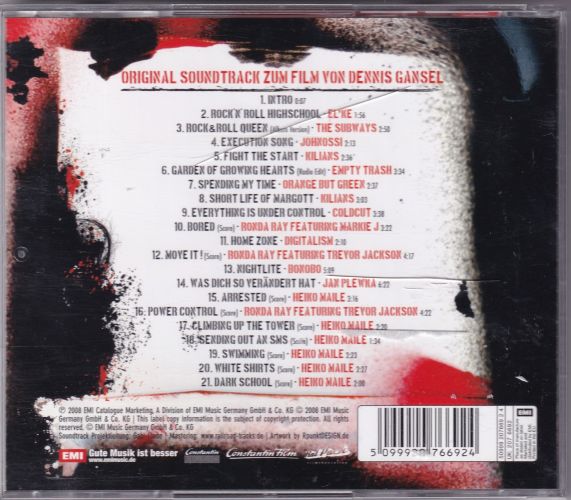 | 01. INTRO 0:07 2008 The copyright in this sound recording is owned by Rat Pack Filmproduktion GmbH | Lyrics – Dennis Gansel, Peter Thorwarth | Constantin Music Verlag GmbH 02. ROCK’N’ ROLL HIGHSCHOOL-EL*KE 1:56 03. ROCK & ROLL QUEEN (Album Version) THE SUBWAYS 2:50 04. EXECUTION SONG · JOHNOSSI 2:13 05. FIGHT THE START – KILIANS 2:36 06. GARDEN OF GROWING HEARTS (Radio Edit) EMPTY TRASH 3:34 07. SPENDING MY TIME – ORANGE BUT GREEN 2:37 08. SHORT LIFE OF MARGOTT · KILIANS 3:03 ℗ 2007 The copyright in this sound recording is owned by Grand Hotel van Cleef, under exclusive license to Universal Music Domestic Division – a division of Universal Music GmbH Composer – Arne Schult, Dominic Lohrberg, Gordian Scholz, Micka Schürmann | Lyrics – Simon den Hartog | Grand Hotel van Cleef Musikverlag | Producer, Engineer & Mixer – Swen Meyer 09. Coldcut – Everything is Under Control 3:38 10. BORED (Score) · RONDA RAY FEATURING MARKIE J 3:22 11. HOME ZONE – DIGITALISM 2:10 12. MOVE IT! (Score) – RONDA RAY FEATURING TREVOR JACKSON 4:17 13. NIGHTLITE – BONOBO 5:09 14. WAS DICH SO VERÄNDERT HAT – JAN PLEWKA 6:22 15. ARRESTED (Score) – HEIKO MAILE 3:16 16. POWER CONTROL (Score) RONDA RAY FEATURING TREVOR JACKSON 4:22 17. CLIMBING UP THE TOWER (Score) HEIKO MAILE 2:20 18. SENDING OUT AN SMS (Score) HEIKO MAILE 1:34 19. SWIMMING (Score) HEIKO MAILE 2:23 20. WHITE SHIRTS (Score) HEIKO MAILE 2:27 21. DARK SCHOOL (Score) HEIKO MAILE 2:00 ORIGINAL FILMMUSIK GASTMUSIKER STUDIOS |