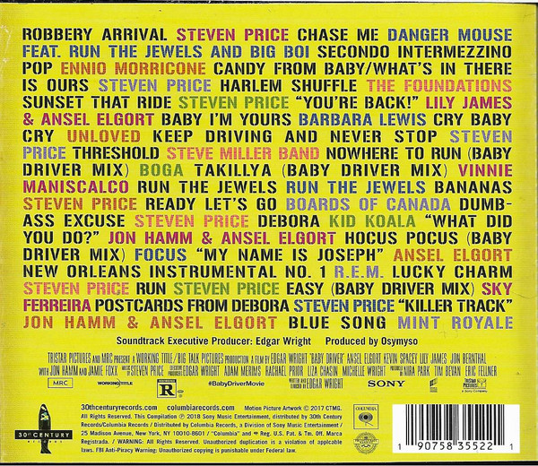 | 01. Steven Price – Robbery Arrival 02. Danger Mouse Feat. Run the Jewels and Big Boi – Chase Me 03. Ennio Morricone – Secondo Intermezzo Pop 04. Steven Price – Candy From Baby / What’s In There Is Ours 05. The Foundations – Harlem Shuffle 06. Steven Price – Sunset That Ride 07. Lily James & Ansel Elgort – You’re Back! 08. Barbara Lewis – Baby I’m Yours 09. Unloved – Cry Baby Cry 10. Steven Price – Keep Driving and Never Stop 11. The Steve Miller Band – Threshold 12. Boga – Nowhere to Run (Baby Driver Mix) 13. Vinnie Maniscalco – TaKillYa (Baby Driver Mix) 14. Run the Jewels – Run the Jewels 15. Steven Price – Bananas 16. Boards of Canada – Ready Let’s Go 17. Steven Price – Dumb-Ass Excuse 18. Kid Koala – Debora 19. Jon Hamm – What Did You Do? 20. Focus – Hocus Pocus (Baby Driver Mix) 21. Ansel Elgort – My Name Is Joseph 22. R.E.M – New Orleans Instrumental No 1 23. Steven Price – Lucky Charm 24. Steven Price – Run 25. Sky Ferreira – Easy (Baby Driver Mix) 26. Steven Price – Postcards from Debora 27. Jon Hamm & Ansel Elgort – Killer Track 28. Mint Royale – Blue Song |