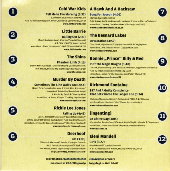 | Mastered at KDG/Elbigenalp beigelegt zu Heft 02/07 01. Cold War Kids – Tell Me In The Morning 02. Little Barrie – Bailing Out 03. The Shins – Phantom Limb 04. Murder By Death – Sometimes The Line Walks You 05. Rickie Lee Jones – Falling Up 06. Deerhoof – +81 07. A Hawk And A Hacksaw – Song For Joseph 08. Besnard Lakes, The – Devastation 09. Bonnie “Prince” Billy & Red – Puff The Magic Dragon 10. Richmond Fontaine – $87 And A Guilty Conscience That Gets Worse The Longer I Go 11. [ingenting] – En Bättre Dag 12. Eleni Mandell – Girls |