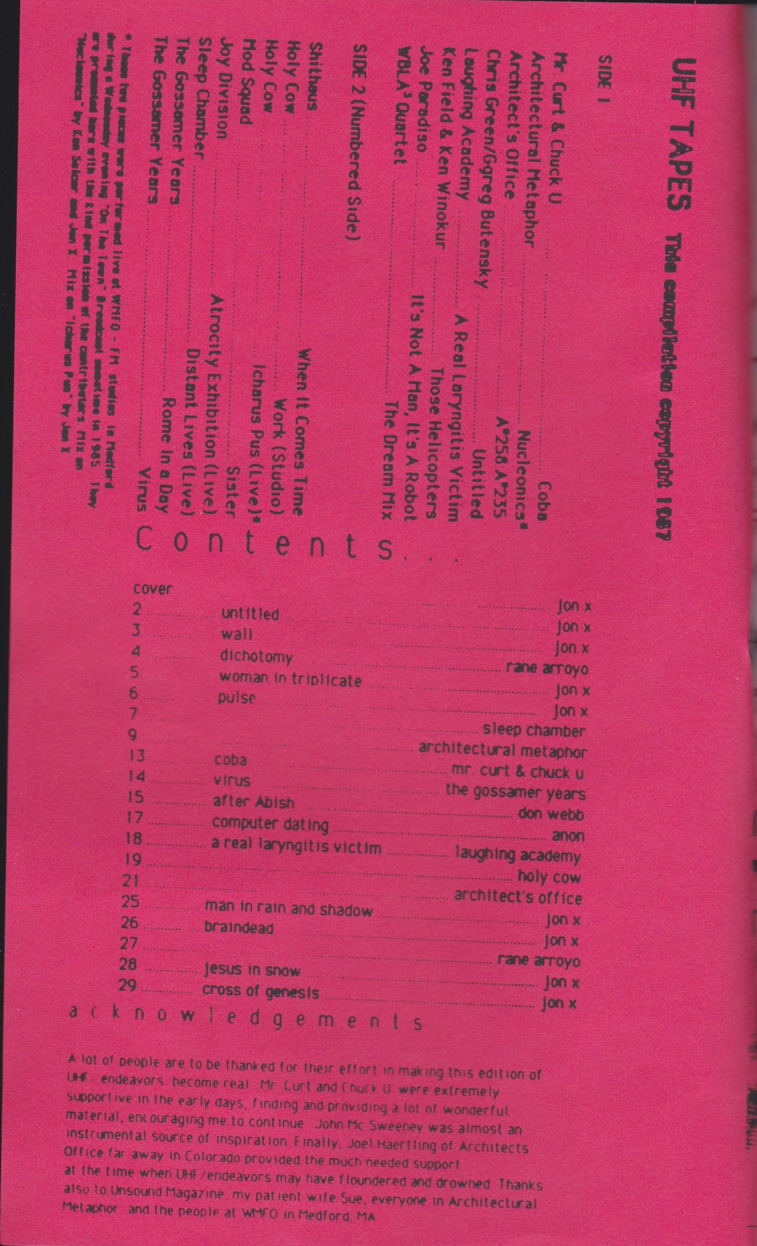 | A2. Architectural Metaphor – Nucleonics* B3. Holy Cow – Icharus Pus (Live) * *These two pieces were performed live at WFMO – FM studies in Medford during a Wednesday evening “On The Town” Broadcast sometime in 1985. They are presented here with the kind permission of the contributors. Mix on “Nucleonics” by Ken Selcer and Jon X. Mix on “Icharus Pus” by Jon X. [Following track notes are exactly as they appear on in the Zip file download from PaulCollegio.net] This is the first in a series of cassette releases that I put out between 1983 and 1991. It began with the idea to put out a xeroxed fanzine and an accompanying cassette. Hardly a novel idea at the time, but one that wasn’t being done to represent the fringe sounds in Boston. Tracks 1 through 8 originally comprised side 1 of the cassette, and the remaining tracks, 9 through 16, side 2. For each track, the file name is given, then the artist and title and a bit of trivia info. UHF14-01 Chuck U. and Mr. Curt “Coba” Incorparating sounds from eauatorial rain forests into their brand of dreamy music, the result is a twilight ritual of natural sounds and electronic. Chuck U., aka Chuck U. Farley, Chuck Rosina, and a range of others, was a disc jockey at WMFo during my tenure, and now hists a show at the MIT station, WMBR. Mr. Curt was a founder of the Boston new wave band Pastiche with several singles on the now defunct imprint run by Newbury Comics, Modern Method. Famous for the PsychoBlonde single. UHF14-02 Architectural Metaphor “Nucleonics” One of Boston’s longest running progressive electronic bands, ArcMet continues to record and perform. Watch for a full length in the upcoming archive series here on the website. UHF14-03 Architect’s Office “A#258:A#235” Strange music from Boulder Colorado, AO was a presence in the early 80’s cassette scene. They have a HUGE credit in that they released an LP on Silent Records “Caswallon the Headhunter” which served as a soundtrack to a Stan Brakhage film. UHF14-04 Chris Gree and Greg Butensky “untitled” Culled from a full length of guitar experiments, these two were also DJs at WMFO. Their full length was slated for release, but was overcome by events. It will appear as part of this archive. UHF14-05 Laughing Academy “A Real Laryngitis Victim” More wonderful music from local musicians. UHF14-06 Ken Field and Ken Winokur “Those Helicopters” Beautiful funky ambient jazz soundtrack musis. Both are still active in music, Ken Winokur now part of Birdsongs of the Mesozoic. UHF14-07 Joe Paradiso “It’s Not A Man It’s A Robot” Genius inventor and Mad Scientist, I met Joe also at WMFO. He currently does some fill in airtime at WZBC. You may have read about Joe in various technical journals for his high tech entertainment consultations for such notables as Penn and Teller. UHF14-08 W-Blah-Blah-Blah Quartet “The Dream Mix” More wonderfulness from the Chuck U. crowd. UHF14-09 Shithaus “When It Comes Time” I dont know much about these guys other than they were friends of Gigi in ModSquad and they went on to form Pussy Galore. UHF14-10 Holy Cow “Work” UHF14-11 Holy Cow “Icharus Pus (live)” While mostly written off as Bauhaus wannabes, they put on one fucken live show. The live track is culled from a performance they did in my studio at WMFO. UHF14-12 Mod Squad “Sister” Groovy. UHF14-13 So…who’s gonna not know who this is? A rare live version, one of the best. UHF14-14 Sleep Chamber “Distant Lives (live)” At the infamous Paradise show. Millions of feathers launched over teh audience by a pair of high speed fans. And the most putrid incense ever. Mesmerizing… UHF14-15 The Gossamer Years “Rome in a Day” |